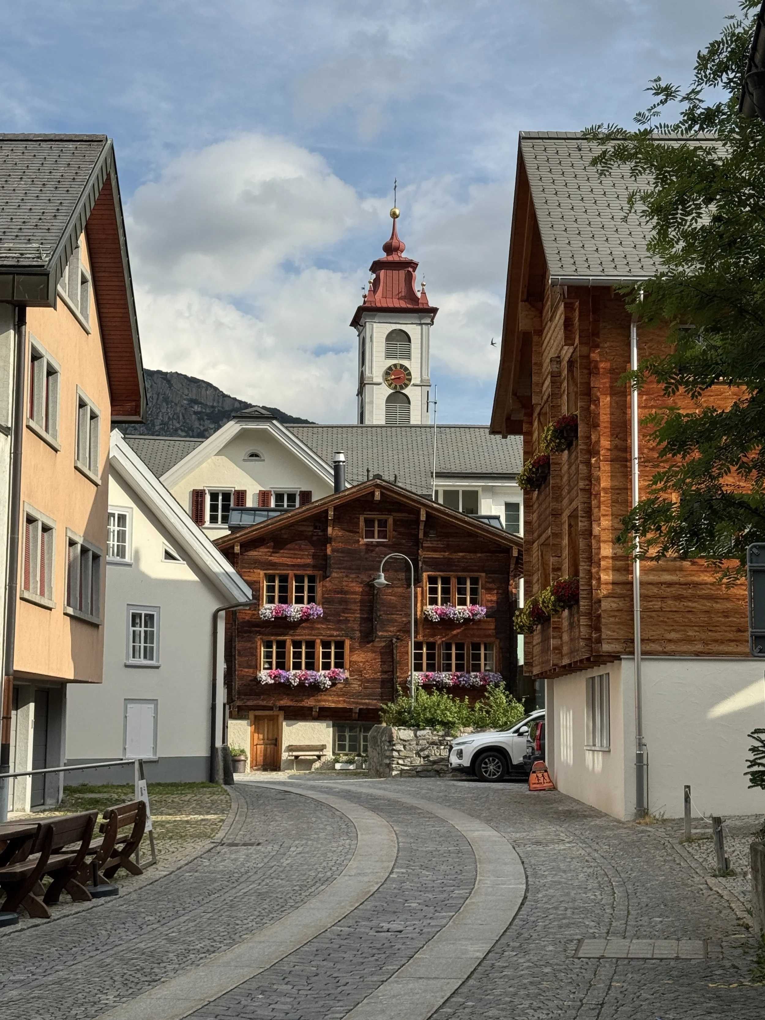 A typical street in Switzerland in the town of Andermatt. Notice how well everything is maintained. While the government does a lot, so too do the individuals. Keeping the flowers in the flowerboxes fresh takes persistent work.
