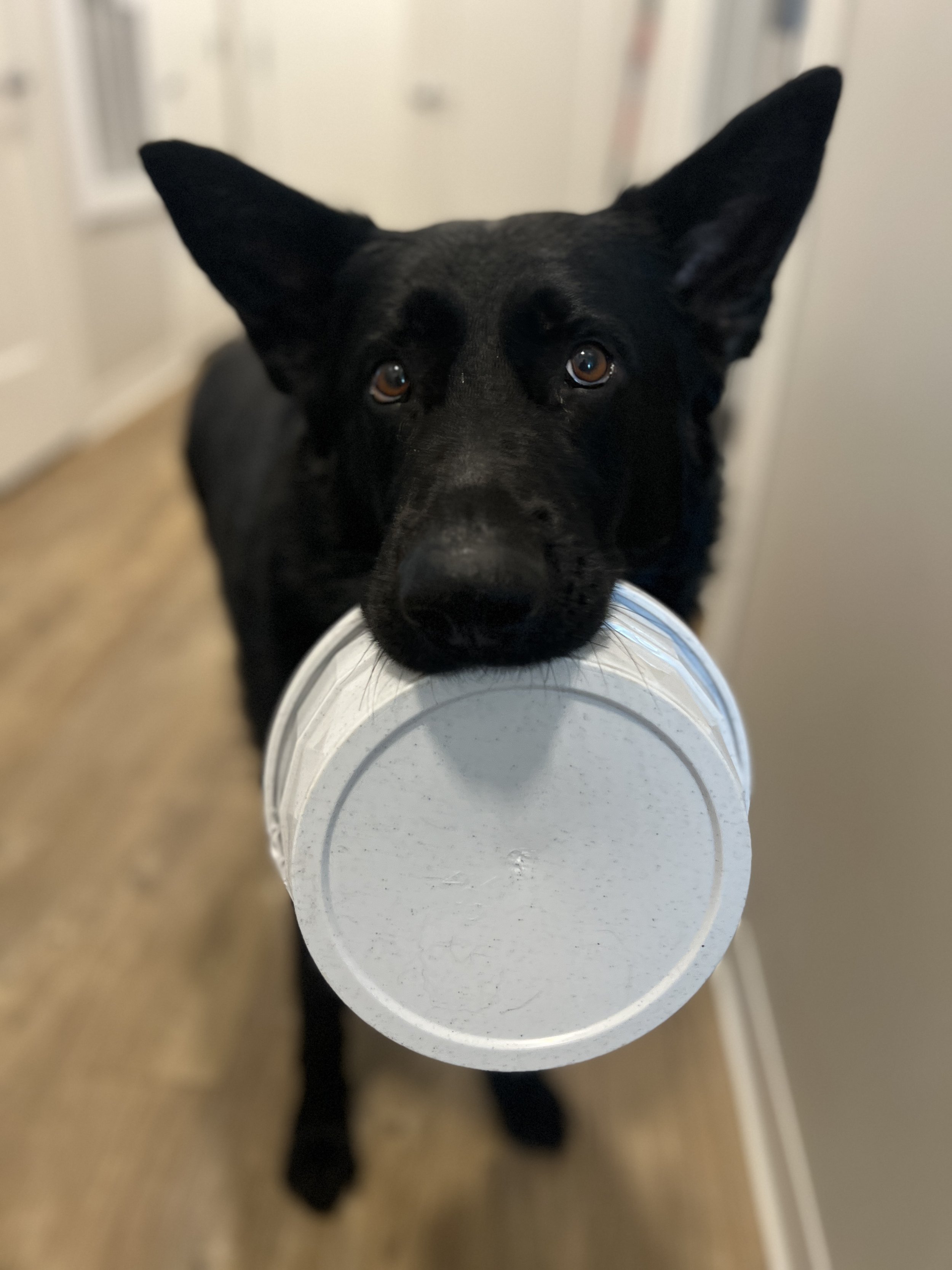 A photo of our black German Shepherd, Sky, demanding food. I didn’t teach him this. I don’t know where he learned it.